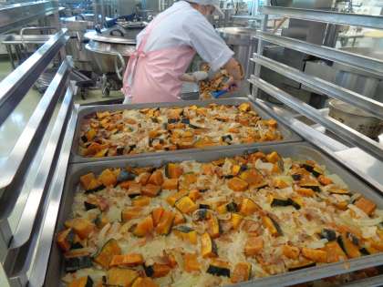 北海道産のかぼちゃを一口大に切って、たまねぎとベーコン・チーズを混ぜてオーブンで蒸し焼きにしました。