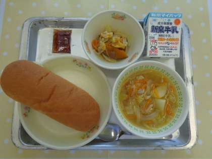 献立は「コッペパン、牛乳、野菜スープ、かぼちゃのチーズ焼、ミックスジャム」でした。