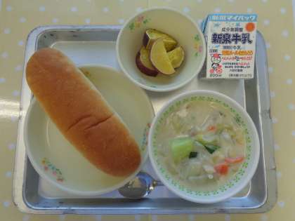 献立は「コッペパン、牛乳、はくさいとチンゲン菜のクリーム煮、焼き芋」でした。