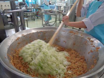 豚ひき肉の他に粒状の高野豆腐も入れてよく煮たら、仕上げに小口切りにした白ねぎを薬味に入れてよく混ぜました。