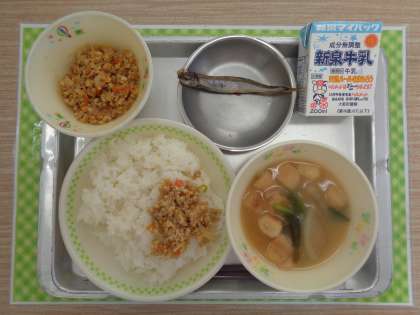 献立は「ご飯、牛乳、みそ汁、そぼろ丼、焼ししゃも」でした。