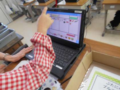 児童用パソコンで様々な食べ物を3つの働きに分けながら学習しました。また、栄養教諭から映像紙芝居を使って食べ物の働きについての説明がありました。