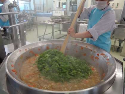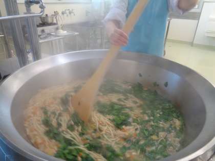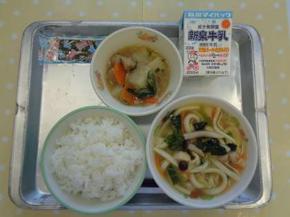 献立は「ご飯、牛乳、かやくうどん、かぶと肉団子のあんかけ、味つけのり」でした。