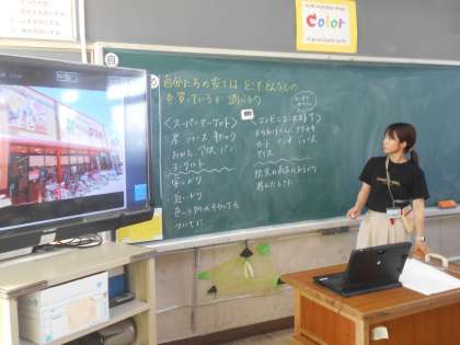 社会で、買い物調べの結果を発表し合っています。
