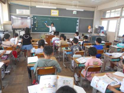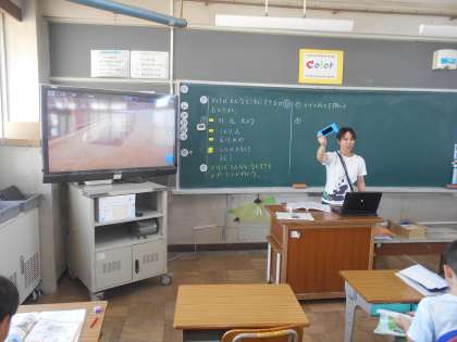 理科の授業でかげのでき方について観察する前にみんなで予想し合っています。