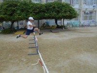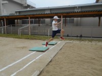 走り幅跳びの練習風景。跳び箱の板を使って,遠くまで跳ぶイメージを体に覚えさせてい...