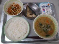 今日の献立は「ごはん,牛乳,野菜たっぷりみそ汁,焼きさば,混ぜたら秋の風味ごは...