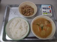今日の給食は「ごはん,牛乳,ちゃんこ汁,豚肉のしょうが炒め」です。「ちゃんこ」...