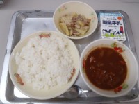 今日の給食は「ごはん,牛乳,ハヤシカレーライス,えのきベーコン」です。 えのき...