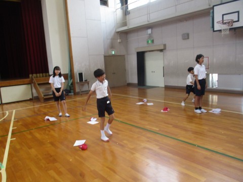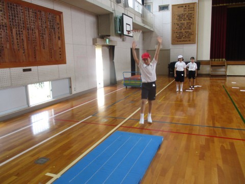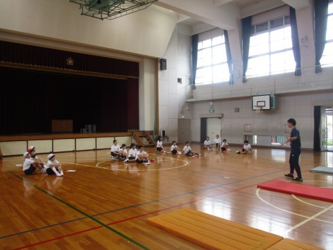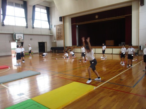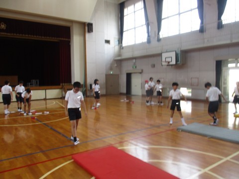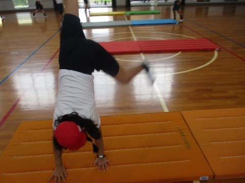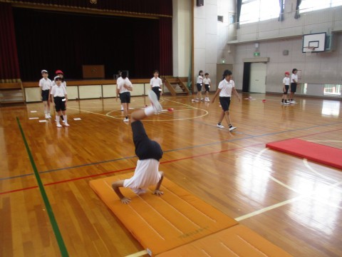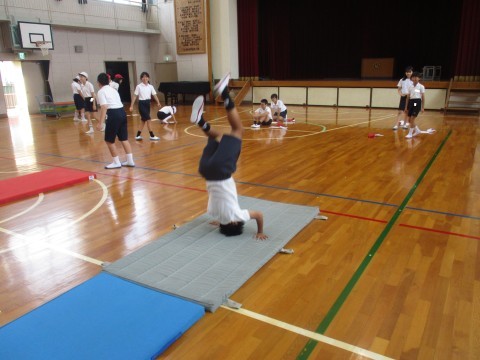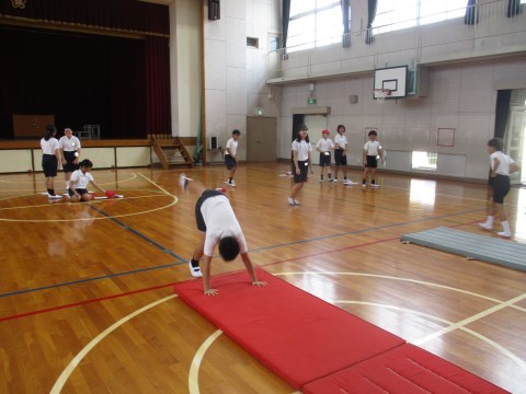 体育の授業の様子です。マット運動で、側転・倒立前転を実施しています。