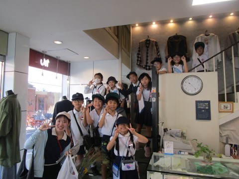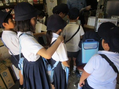 まちたんけんの様子です。堺刀司さん、花ひめさん、ミネルバさん、河吉酒店さん、毎日屋クリーニングさんに伺いました。ありがとうございました。