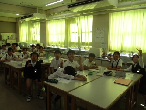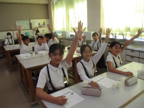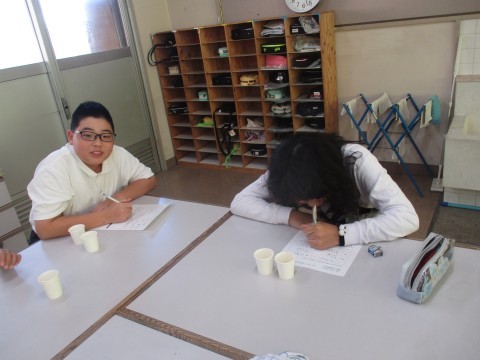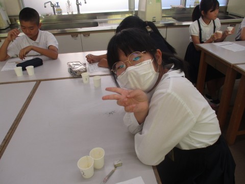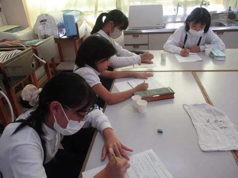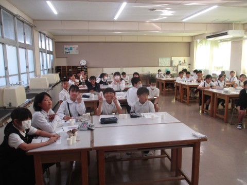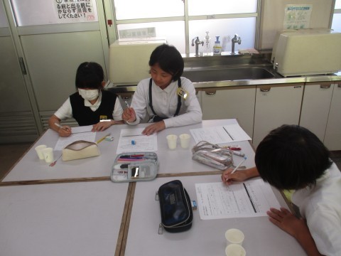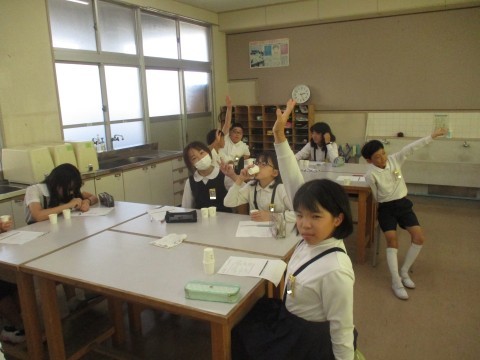 家庭科の授業の様子です。だしを使っているみそ汁をみんなで見つけました。