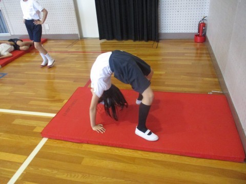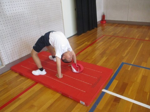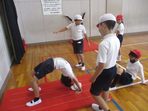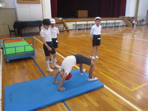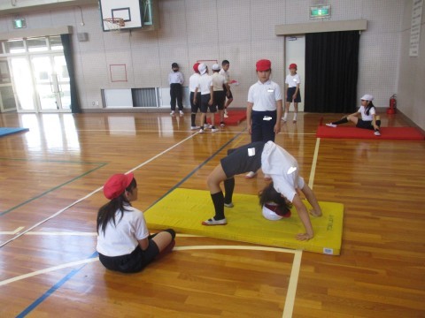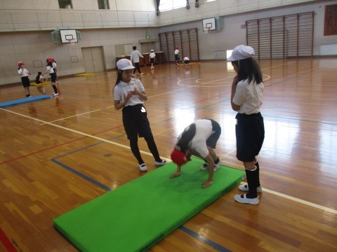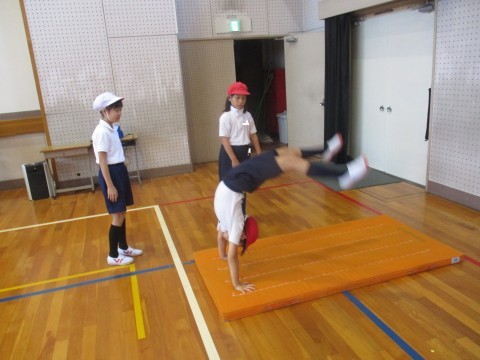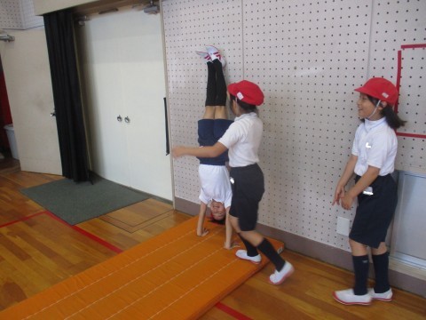 体育の授業の様子です。マット運動で倒立や開脚前転など練習しました。