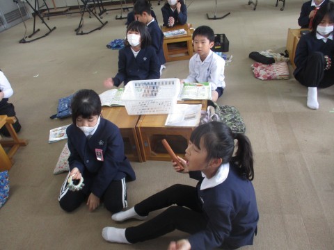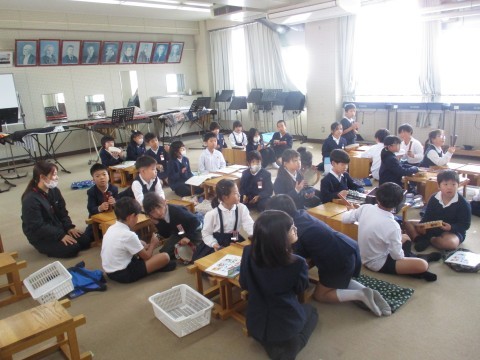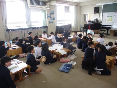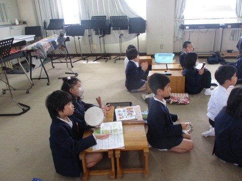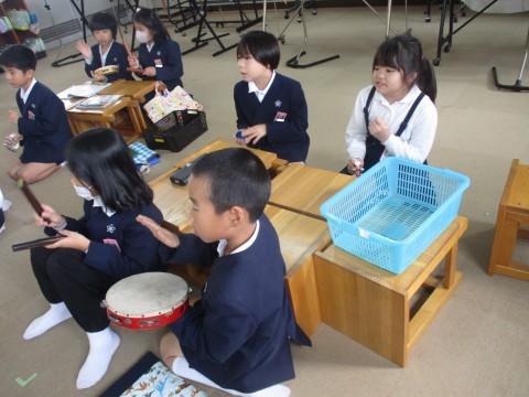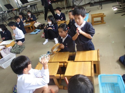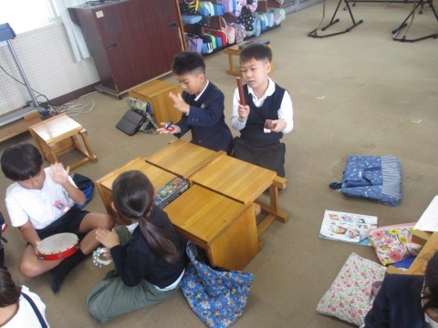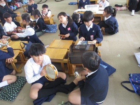 音楽の授業の様子です。曲に合わせて色々な楽器を使い音を奏でました。