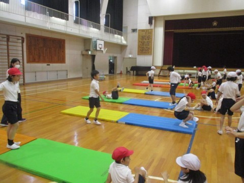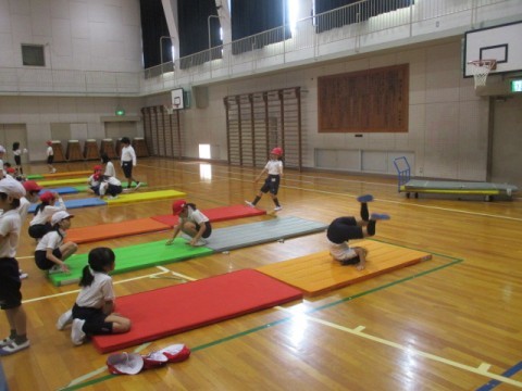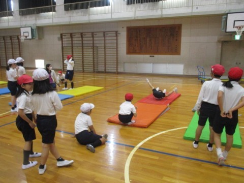 体育でマット運動に取り組んでいました。