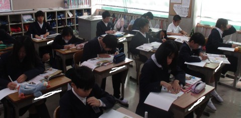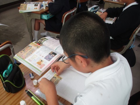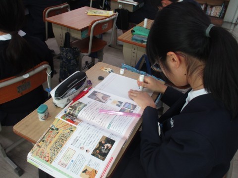 社会の授業の様子です。江戸時代の人々はどのような文化を楽しんでいたか学びました。