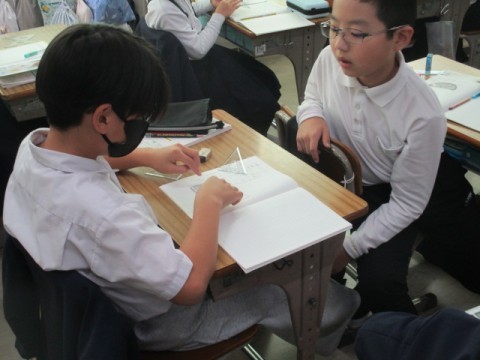 平行な直線に対して交わる直線は全て角度が同じということを分度器を使って調べていました。