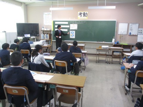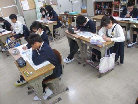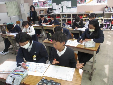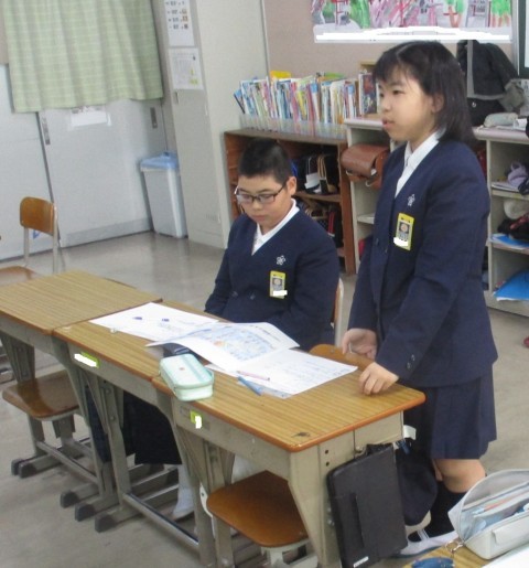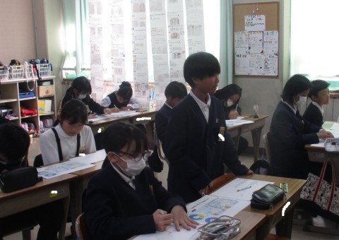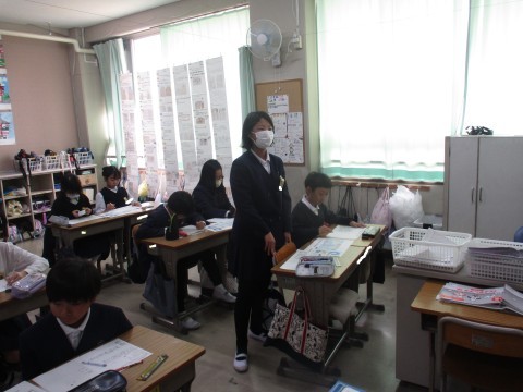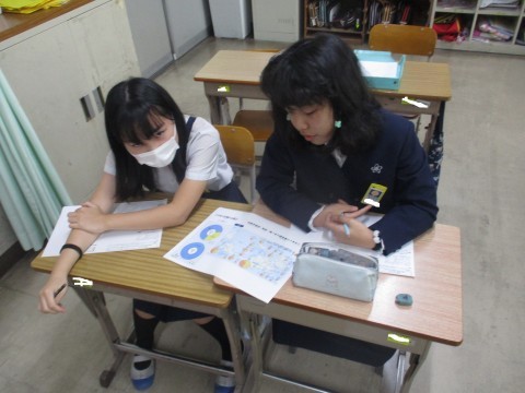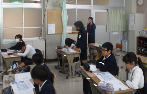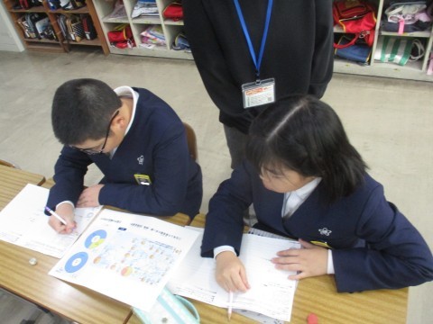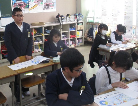 社会の授業の様子です。輸出と輸入の円グラフや輸送方法の違いを見て気づいたことを発表しました。