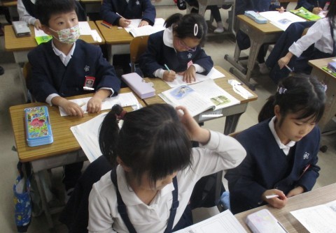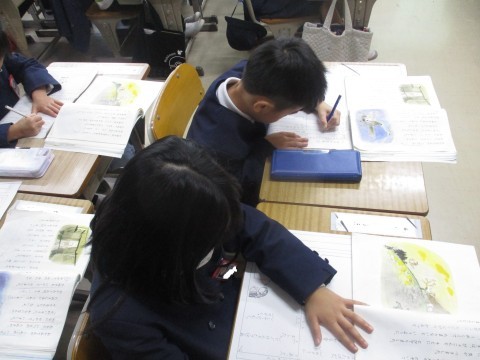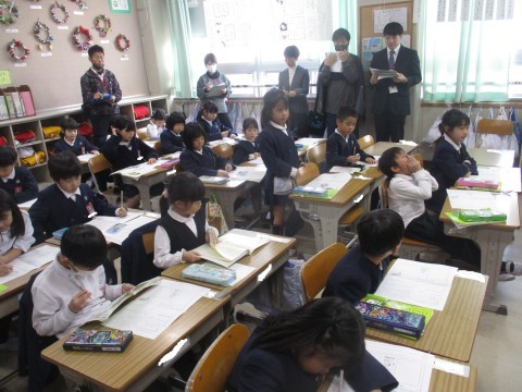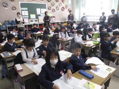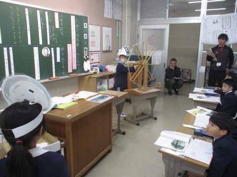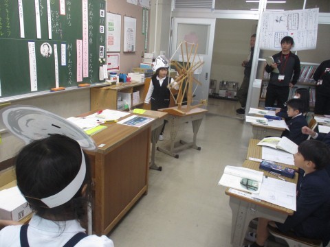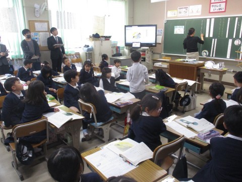 国語の授業の様子です。校内の研究授業でした。たぬきの糸車の単元で、たぬきとおかみさんの行動を読み解き、気持ちを想像しました。