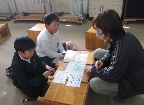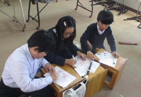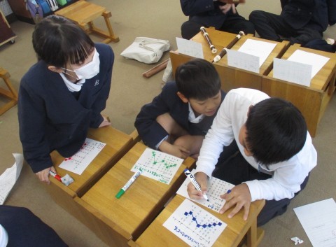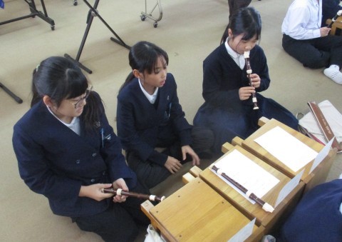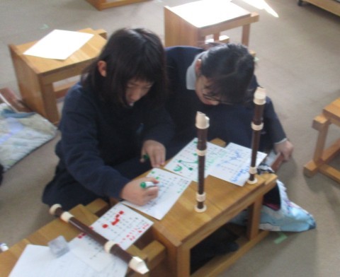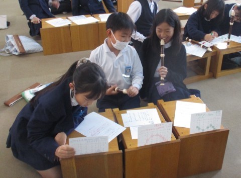 音楽の授業の様子です。リコーダーで繰り返してまとまりのある音楽を考えました。