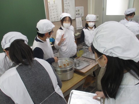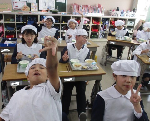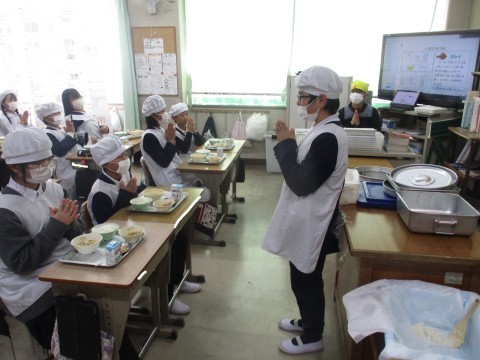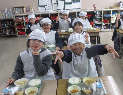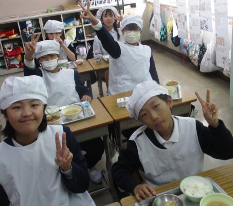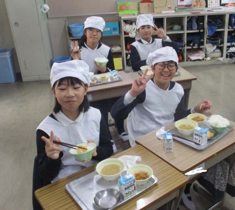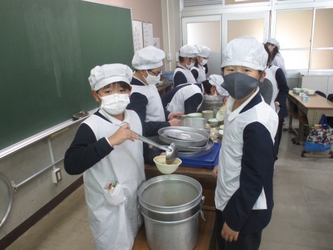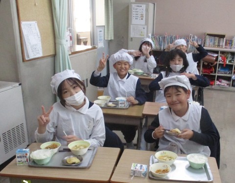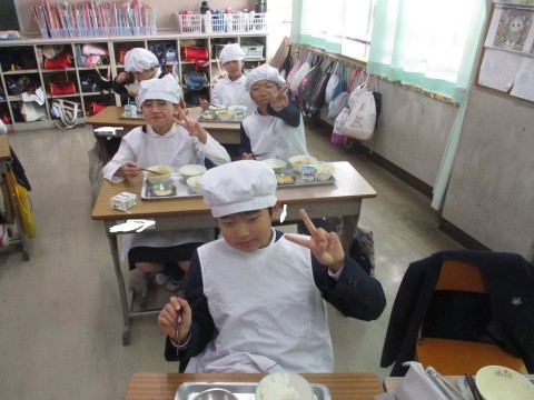給食の時間の様子です。しっかり準備もできておいしくいただいています。