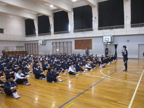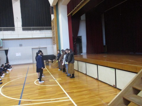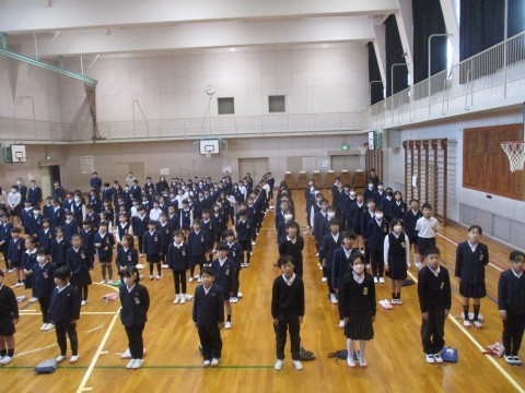 児童朝礼の様子です。今日はPTAのリサイクルブックの贈呈式が行われました。図書委員が代表して受け取らせていただきました。ありがとうございました。また、先生より服装や帽子の着用についてお話がありました。