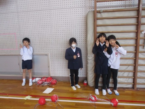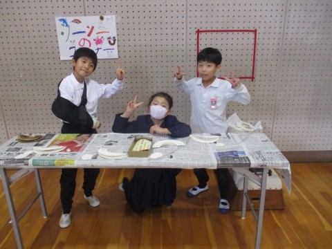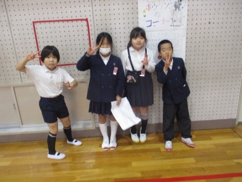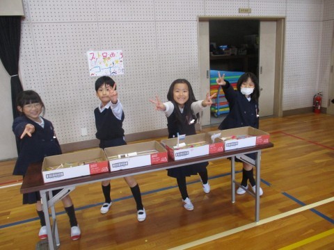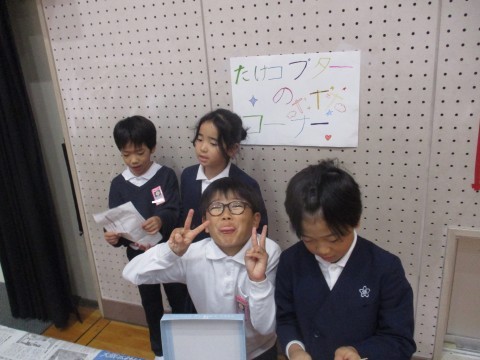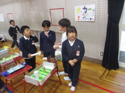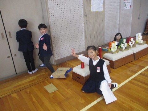 今日は2年生がつくった色々なおもちゃを1年生に紹介しました。とても上手に作れていますね。