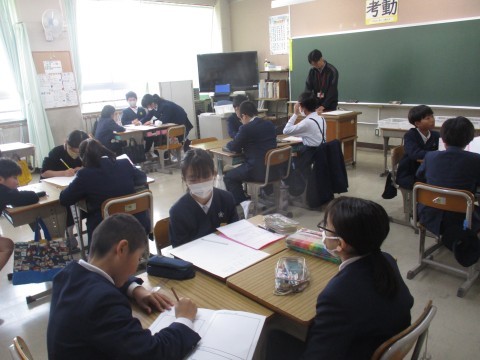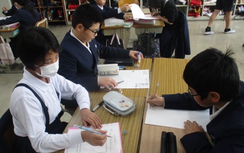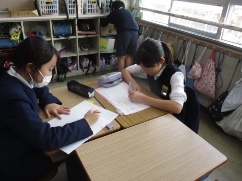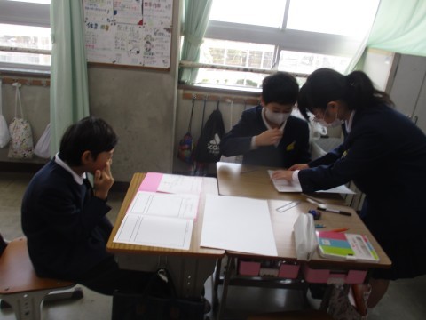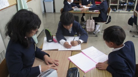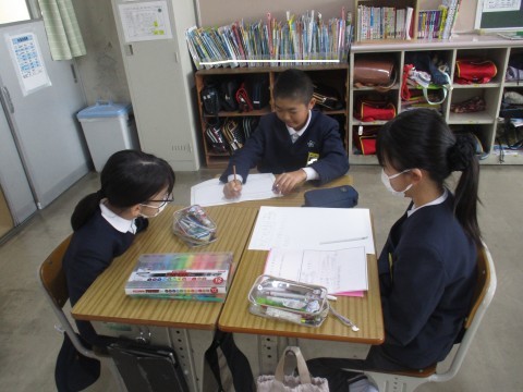 理科の授業の様子です。ふりこの実験結果についてグループでまとめました。