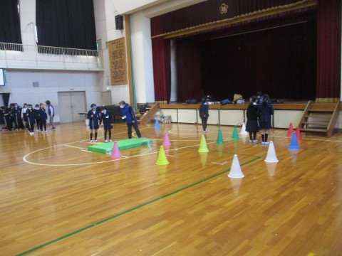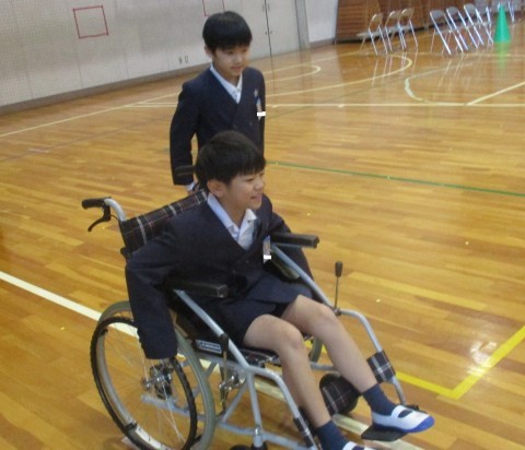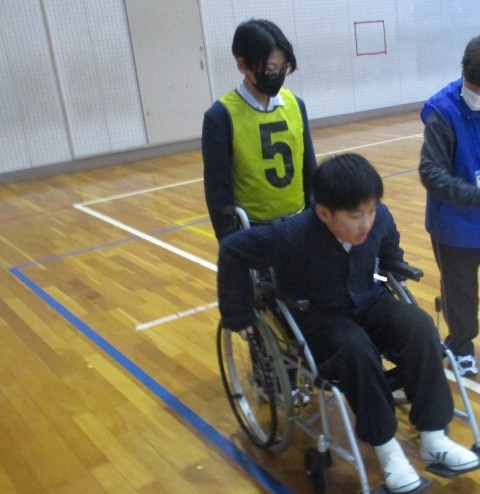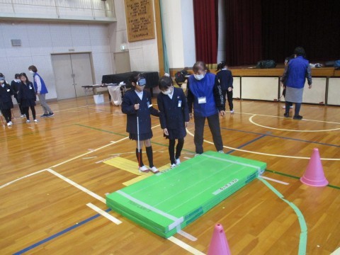 キャップハンディ体験の様子です。障害のある人の立場や困難を理解し、共生社会への気づきを深めることができました。ありがとうございました。