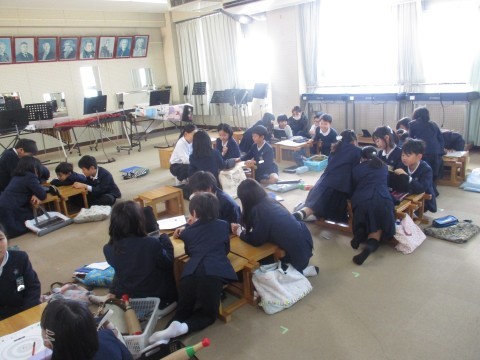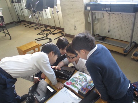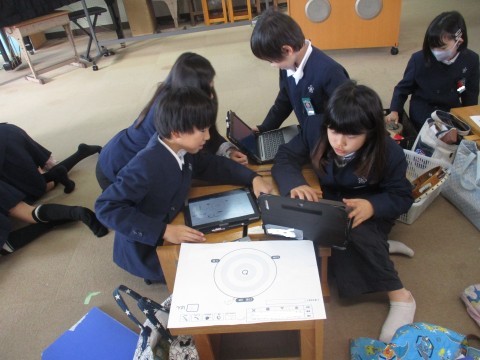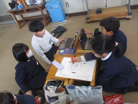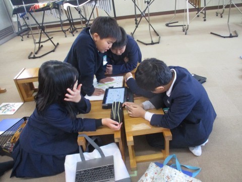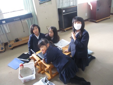 音楽の授業の様子です。クロックミュージックのためにグループで作戦会議をしています。どの楽器にするか決まったかな!?