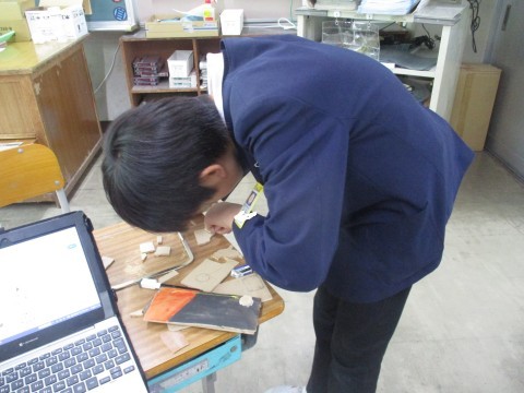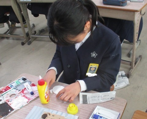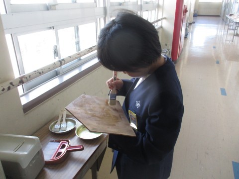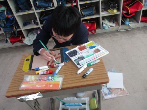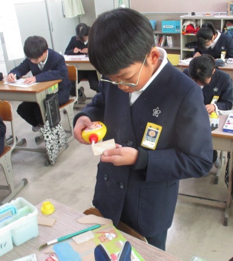 図工の授業の様子です。最後は色付け、ニスを塗り完成しました。