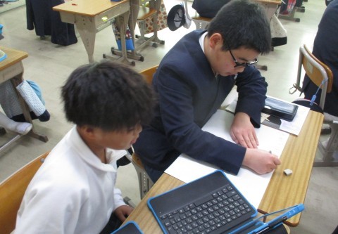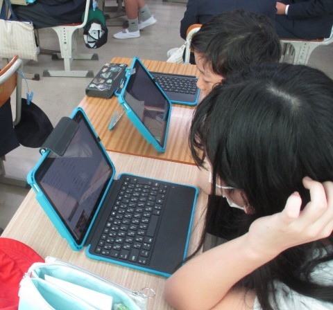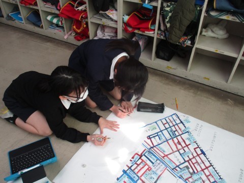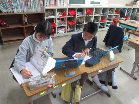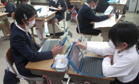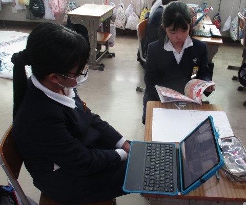 総合の授業の様子です。防災を中心に自分たちで決めたテーマで学習を進めています。ハザードマップや南海トラフ地震等調べています。
