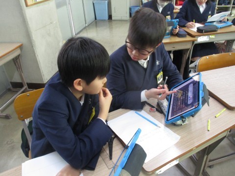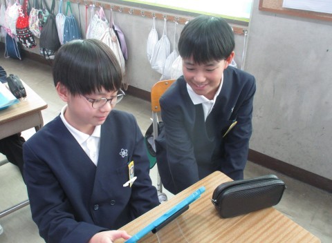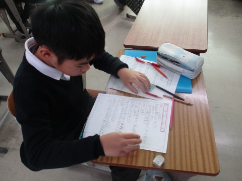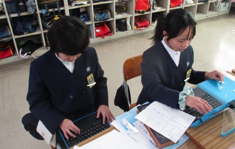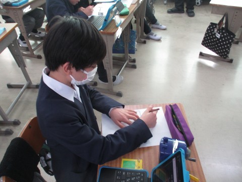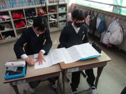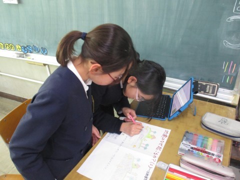 総合の授業の様子です。地震はなぜおこるの?避難バックの中身など調べたことをグループで記載しました。