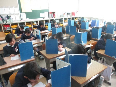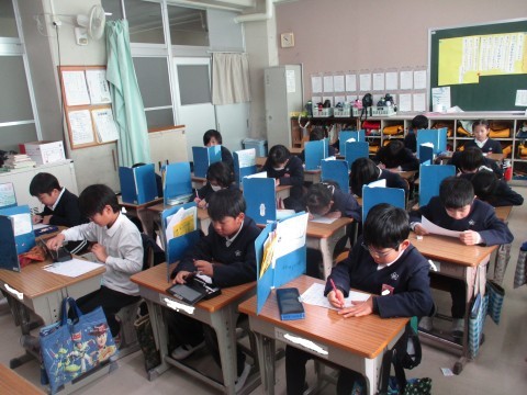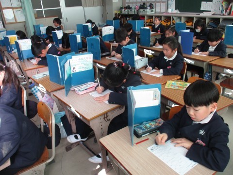 国語の授業の様子です。今日は漢字のテストでした。みんな真剣な表情で取り組んでいます。