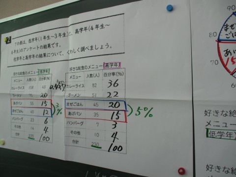 算数の授業の様子です。それぞれのグラフを比べ、気付いたことをみんなで共有しました。
