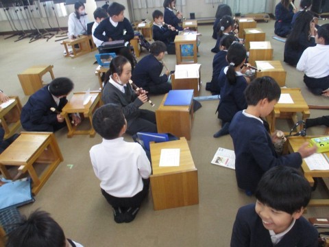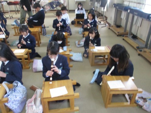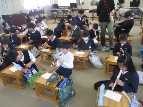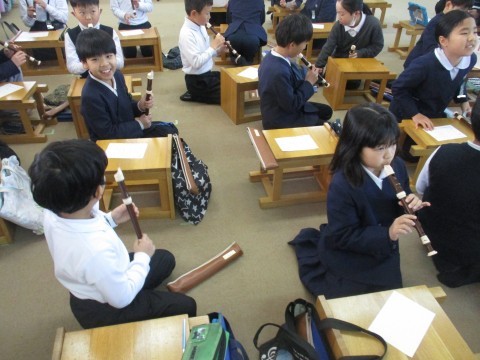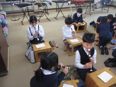 音楽の授業の様子です。自分の旋律をリコーダーで吹けるようにしともだちとつなげました。