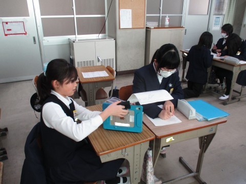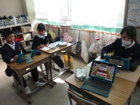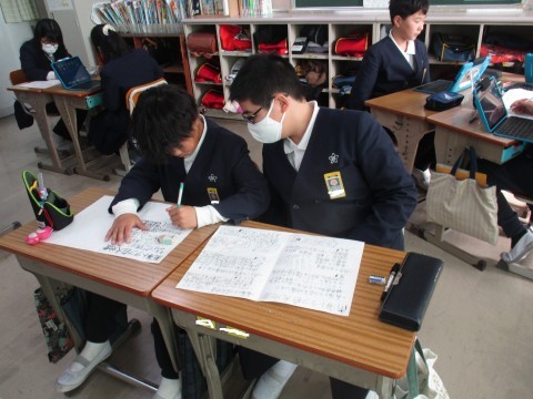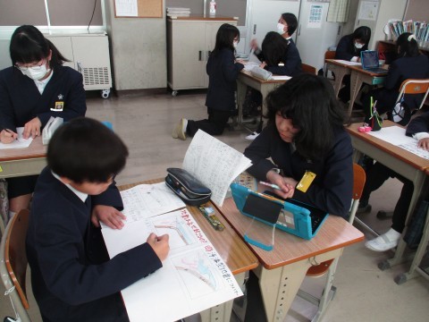 総合の授業の様子です。防災に関する発表に向けて準備を進めています。