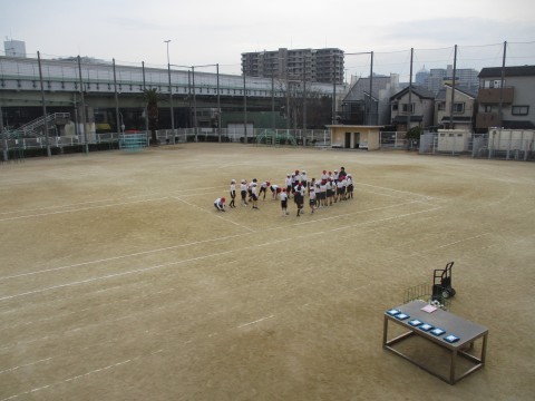 体育の授業の様子です。試合に向けてパス連携を強化しています。
