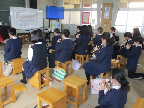 5年1組は音楽でリコーダーに取り組んでいました。卒業式で演奏する「威風堂々」の練習をしていました。