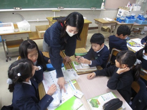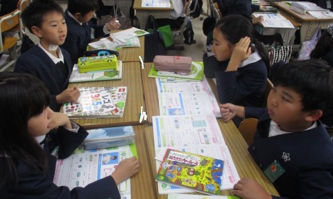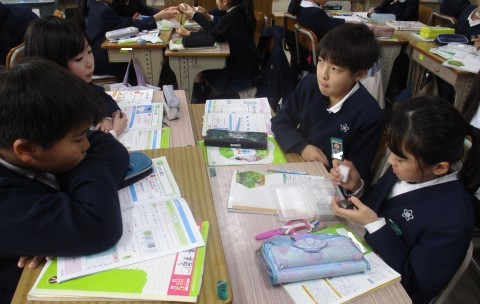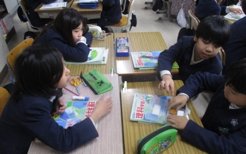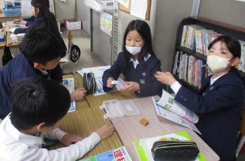 理科の授業の様子です。同じ体積のものは同じ重さか触って確認しました。違いについて知ることができましたね。