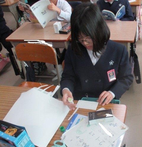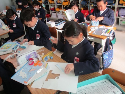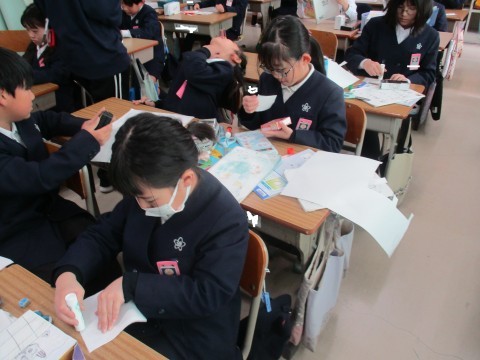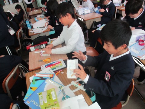 算数の授業の様子です。箱の組み立て方を学びました。真剣に取り組んでいます。