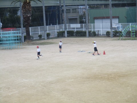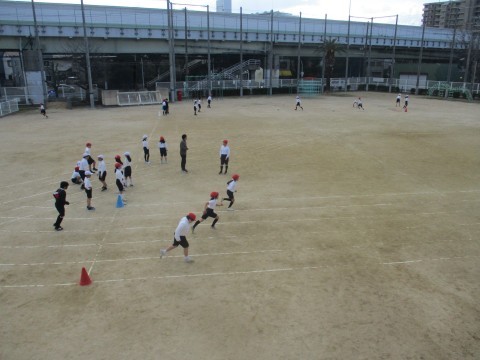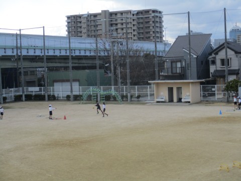 体育の授業の様子です。寒さに負けず、子どもたちはしっかり取り組んでいます。ハードルやボールを使い体力・技術向上を目指しています。