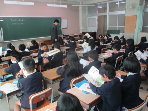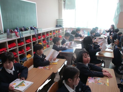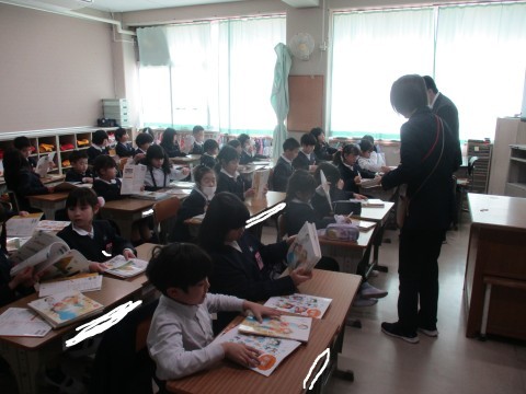 新しい担任の先生から教科書が配布されました。みんなで確認しています。
