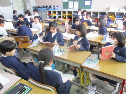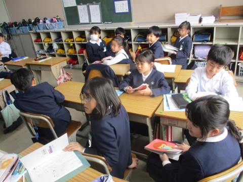 国語の授業の様子です。前の人の話を聞いて繰り返して自己紹介をグループでしました。