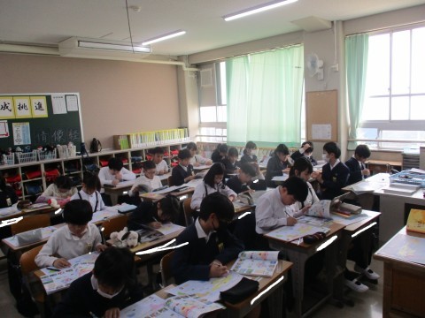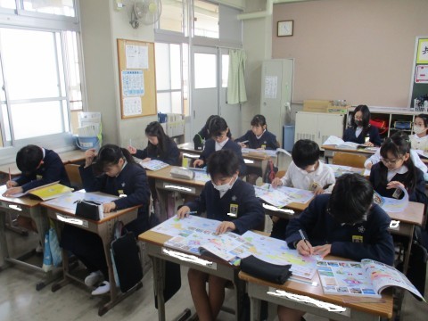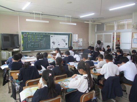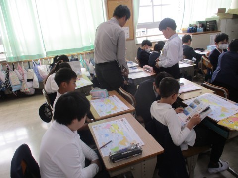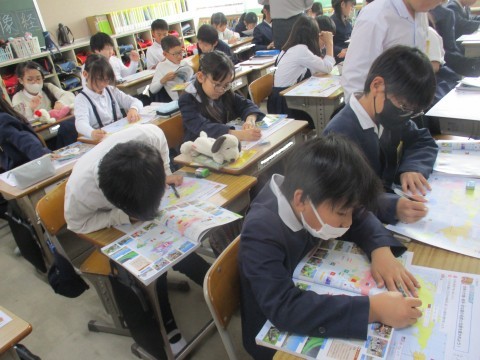 社会の授業の様子です。世界の海洋・大陸・主な国を覚え記載しました。