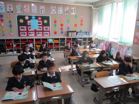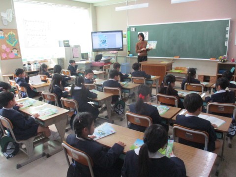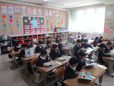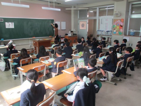 国語の授業の様子です。新しい教科書を開き先生のお話を真剣な表情で聞いています。また、先生に続いて音読をしました。