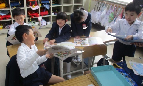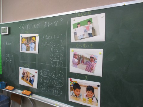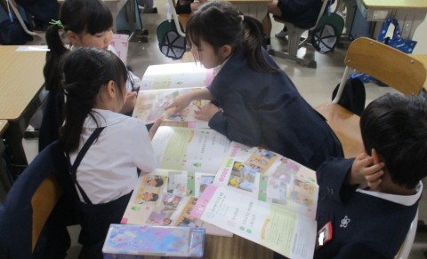算数の授業の様子です。ものの多い少ない?大きい小さい?などグループで話し合っています。