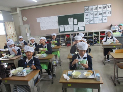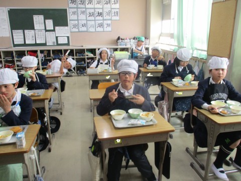 給食の時間の様子です。今日もおいしくいただいています。