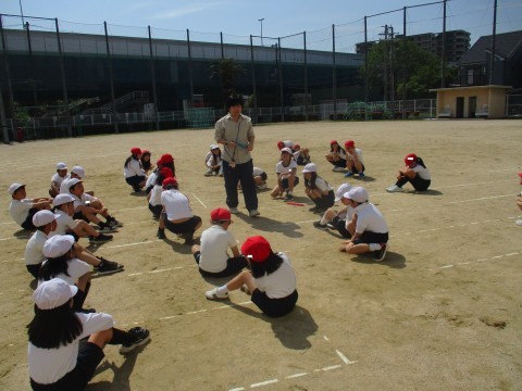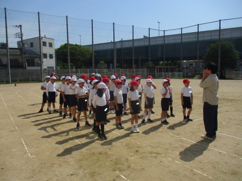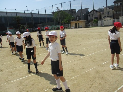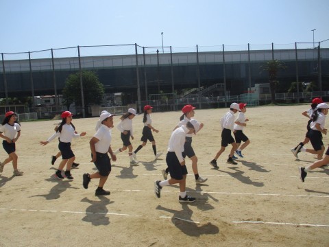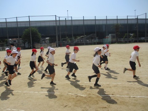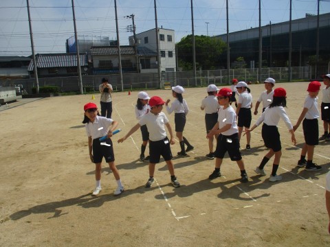 体育の授業の様子です。ランニングした後に、バトンパスの練習をしました。
