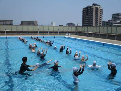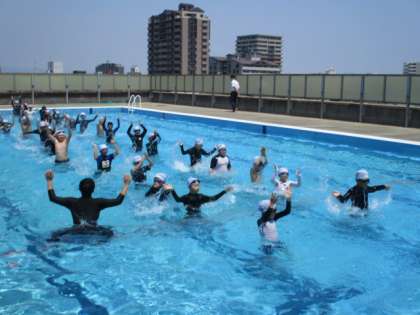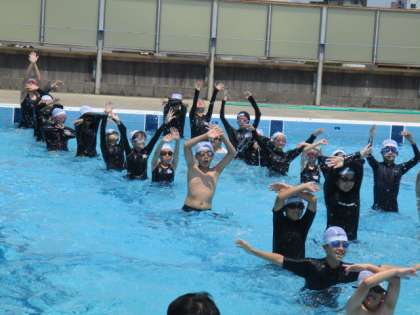 5年生も、青空のもと、プールに入りました。ディス イズ ミーの曲に合わせて、踊りました。